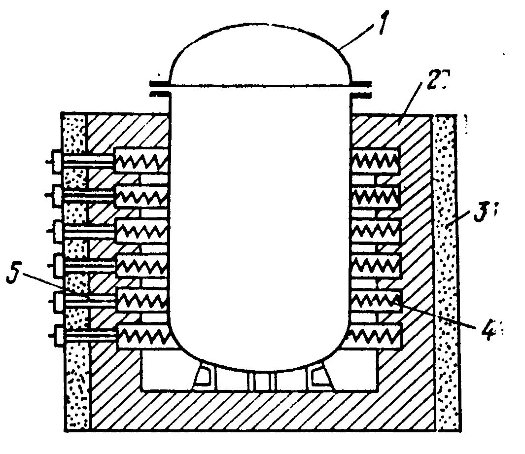 Рис. 6. Элекрическая печь сопротивления косвенного действия: 1 —обогреваемый аппарат; 2— футеровка печи- 3—-тепловая изоляция; 4— спиральные нагревательные элементы; 5— выводные электрошины.