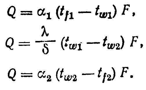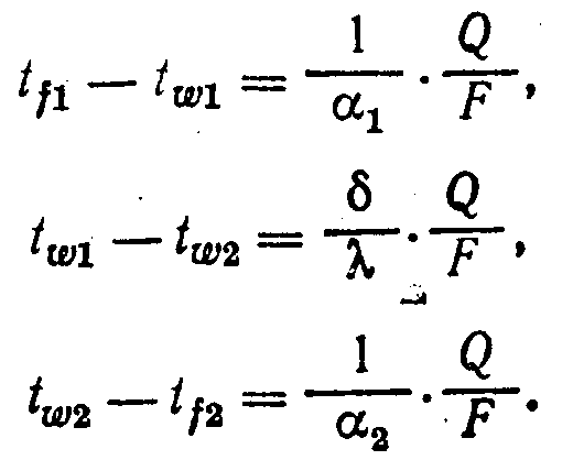Соотношение для расчета коэффициента теплопередачи можно вывести, рассмотрев процесс передачи тепла от одного теплоносителя к другому через разделяющую их стенку. На рис. 1 показана плоская стенка толщиной , материал которой имеет коэффициент теплопроводности . По одну сторону стенки протекает теплоноситель с температурой t>f1> в ядре потока, по другую сторону—теплоноситель с температурой t>f2>. Температуры поверхностей стенки t>w1> и t>w2>. Коэффициенты теплоотдачи >1> и >2>. При установившемся процессе количество тепла, передаваемого в единицу времени через площадку F от ядра потока первого теплоносителя к стенке, равно количеству тепла, передаваемого через стенку и от стенки к ядру потока второго теплоносителя.