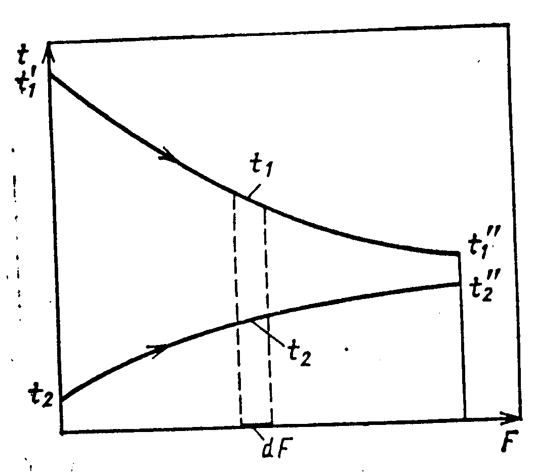 На рис. 2 показан характер изменения температур теплоносителей «при прямоточном движении их вдоль поверхности теплообмена. Один из теплоносителей охлаждается от температуры t’>1> до t’’>1>, другой нагревается от t’>2> до t’’>2>. Количество тепла, переданное в единицу времени от первого теплоносителя ко второму на произвольно выделенном элементе теплообменной поверхности можно определить по основному уравнению теплопередачи: