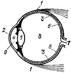 Глаз человека имеет приблизительно шарообразную форму; диаметр его (в среднем) 2,5 см (рис. 1); глаз окружен снаружи тремя оболочками.