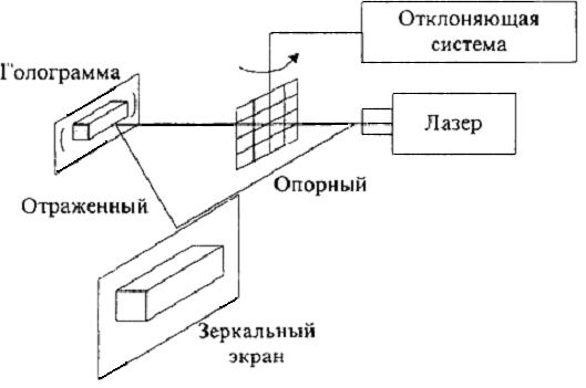 Голографические устройства - это своеобразные ВЗУ. Возможно составление картотеки разных объектов, которые могут воспроизводиться по мере надобности. Голограмма может быть введена в ЭВМ с помощью устройства считывания изображений - сканера, и выведена из ЭВМ и восстановлена на носителе. Для этого ее выводят на экран электронно-лучевой трубки (ЭЛТ) дисплея и затем фотографируют. При этом важное значение имеют вопросы синхронизации развертки ЭЛТ и сканирования лазерного луча.