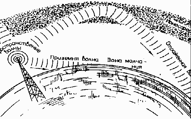 Средние волны днем сильно поглощаются ионосферным слоем и район действия определяется только приземной волной. Вечером однако, они хорошо отражаются ионосферой и район действия определяется отраженной волной (рис:. 3). Поэтому средневолновые передатчики принимаются вечером лучше и дальше, чем днем.