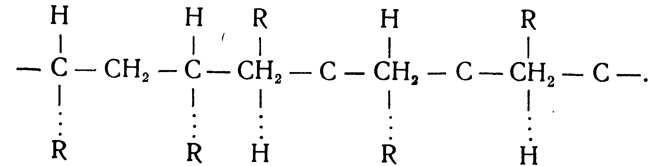 Оскільки поліетилен-полімер, який не являється єдиним для характеристики конфігурації, на схемі один із атомів водню кожної ланки замінено на радикал R. Це нестереорегулярний чи атактичний полімер: радикал R розміщений з обох боків площини, в якій знаходиться виправлений ланцюг без будь-якого порядку. У більшості випадків такий полімер не може кристалізуватися.