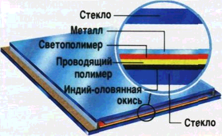 Модель шарів: у скляній оболонці полімерні плівки оточені провідними матеріалами