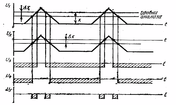 С помощью амплитудных селекторов и формирователей вырабатываются прямоугольные импульсы длительность которых равна времени пребывания входного сигнала ниже порогов селекции. Величина постоянной составляющей на выходе ВС пропорциональна P{X(t)<=x} на выходе НС - P{X(t)<=x-Dx}, на выходе ВУ:
