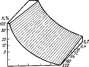 Кроме яркости и размеров индикатора, решающую роль в его восприятии играет контрастность воспроизво-димого знака. Қоличественно яркостный контраст определяется как К=(L—L>фон>)/ L, где L L>фон> — яркости источника и фона. Практически для качествеичого восприятия важна не столько величина К, сколько ее пре-вышение над пороговой для данных условий контрастностью K>пор>. Для хорошей видимости необходимо, чтобы число пороговых контрастов (К/ K>пор>) было не менее 15 ... 30. Зависимость порога зрительного восприятия от угловых размеров, яркости и контрастности наблюдаемых объектов представлена на рис. 3.2. Заштрихованная поверхность соответствует порогу зрительного восприятия: точки, лежащие ниже нее, соответствуют условиям, не вызывающим зрительных ощущений.