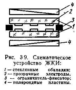 Устройство жидкокристаллического индикатора (рис. 3.9) достаточно просто, здесь удобно реализуюгся современные плоские панельные конструкции. Для получения низких управляющих напряжений (единицы вольт) зазор между пластинами должен быть небольшим (~10-3 см), а используемая жидкость должна