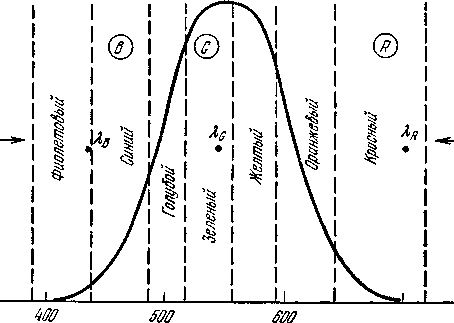 Современное учение о цветге базируется на том экспериментально установленном факте, что «элементар-ные фотоприемники» глазной сетчатки — колбочки содержат рецепторы трех видов, каждый из которых обладает повышенной чувствительностью в красной, зеленой и синей областях спектра. Соответственно этому говорят о трех основных цветах - R, G, B, сочетание которых позволяет синтезнровать всю цветовую гамму. Математически это означает, что цветовое ощущение можно рассматривать как вектор в трехмерном пространстве, осями которого являются R-, G-, B-векторы (принято λ>r> =700 нм, λ>g> —546 нм, λ>b> =436 нм,см рис. 3.1).