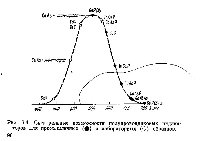 3.1 Полупроводниковые индикаторы (ППИ) примечательны прежде всего тем, что могут перекрыть весь видимый диапазон спектра (рис. 3.4). Яркое и чистое свечение, удобство управлеиия, экономичность, технологичность, долговечность открывают перед этими приборами безграничные перспективы.