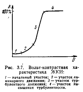 При некотором значении тока проводимости возникает состояние турбулентности, разрушающее ранее упо-рядоченную структуру ЖК. Беспрерывные хаотические изменения показателя преломления участков жидкости вызывают рассеяние света (отсюда и название эффекта), внешне проявляющееся как помутнение ЖК. Вольт-контрастная характеристика ЖКИ представлена на рис. 3.7.