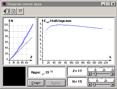 Энергия связи ядер Программа предназначена для ознакомления с понятием энергии связи ядер и дефекта массы. На экран выводятся графики зависимости числа нейтронов от числа протонов в стабильных ядрах и зависимости удельной энергии связи нуклонов в ядре от массового числа. Программа позволяет подбирать различные сочетания чисел нейтронов и протонов для образования стабильного ядра и определить для этого ядра формулу химического элемента и удельную энергию связи.