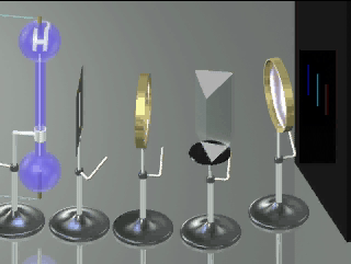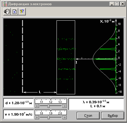 Дифракция электронов Программа иллюстрирует основную концепцию современной квантовой физики - понятие двойственной природы всех материальных объектов. Она моделирует явление рассеяния электронов в кристаллах с помощью мысленного эксперимента по дифракции электронных волн на одномерной решетке. Показано, что дифракционная картина образуется в результате вероятностного процесса. Предусмотрена возможность изменения периода решетки и скорости электронов.