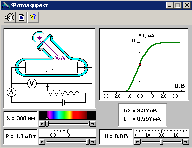 Фотоэффект Компьютерная программа предназначена для изучения законов фотоэлектрического эффекта. Предусмотрена возможность выбора ряда параметров: длины волны и интенсивности падающего света, величины и знака напряжения между анодом и фотокатодом. Программа позволяет измерить задерживающий потенциал и определить красную границу фотоэффекта.