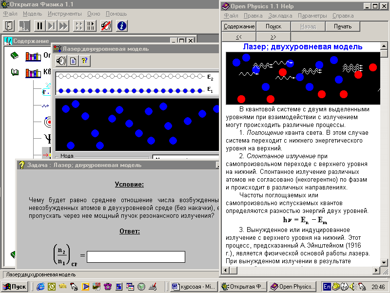 Рис. 1 Общий вид программы с открытой моделью «Лазер: двухуровневая модель»,задачей на эту тему и теорией по теме.