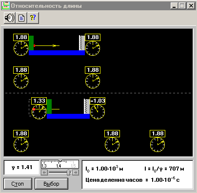 Относительность длины Программа позволяет изучить постулаты специальной теории относительности Эйнштейна - принцип относительности и принцип постоянства скорости света. Программа моделирует эксперимент по измерению длины твердого тела двумя наблюдателями, находящимися в различных инерциальных системах отсчета. Возможно изменение относительной скорости систем отсчета. Результат измерения длины стержня в движущейся системе отсчета выводится на экран дисплея.