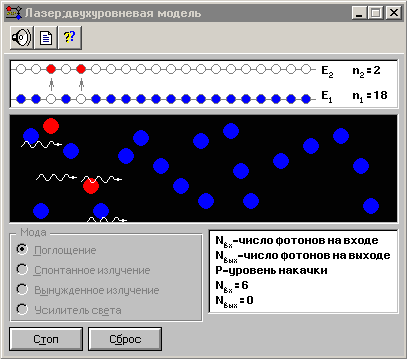 Лазер; двухуровневая модель Компьютерная программа представляет модель различных процессов, возникающих при распространении резонансного светового пучка в квантовой системе с двумя энергетическими уровнями: поглощение фотонов, спонтанное и стимулированное излучение. Программа позволяет познакомиться с понятиями накачки, инверсной населенности уровней и усилителя света.