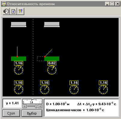 Относительность времени Программа позволяет познакомиться с одним из важных следствий специальной теории относительности Эйнштейна - относительностью промежутков времени. На экране дисплея представлен эксперимент по измерению интервала времени между двумя событиями наблюдателями в различных системах отсчета. Результаты измерения собственного времени и времени по часам движущегося наблюдателя выводятся на экран дисплея.