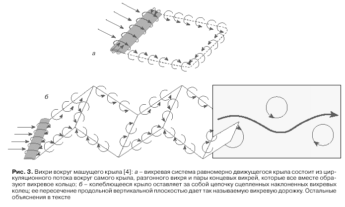 Рассмотрим работу машущего крыла с позиции принципов, заложенных в обоих подходах. Как только крыло начинает двигаться, у его задней кромки образуется разгонный вихрь. Этот вихрь через концевые вихри смыкается с циркуляционным потоком вокруг крыла, образуя кольцо (рис. 3 ,а). При внезапной остановке движущего крыла слой приторможенного воздуха, наиболее близкий к поверхности профиля (пограничный слой), верхней дужки профиля, движущейся более быстро, нежели на нижней дужке, обтекая заднюю кромку, сворачивается в вихрь, который имеет противоположное по сравнению с разгонным направление вращения и такую же по величине интенсивность; он называется тормозным вихрем. Таким образом, движущее крыло несет вихревое кольцо, которое освобождается при его остановке.