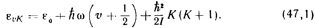 Как известно, уровень энергии двухатомной молекулы складывается в известном приближении из трех независимых частей—электронной энергии (в которую включают также и энергию кулонового взаимодействия ядер в их равновесном положении и которую мы будем отсчитывать от суммы энергий разведенных атомов), вращательной энергии и энергии колебаний ядер внутри молекулы. Для синглетного электронного терма эти уровни могут быть написаны в виде: