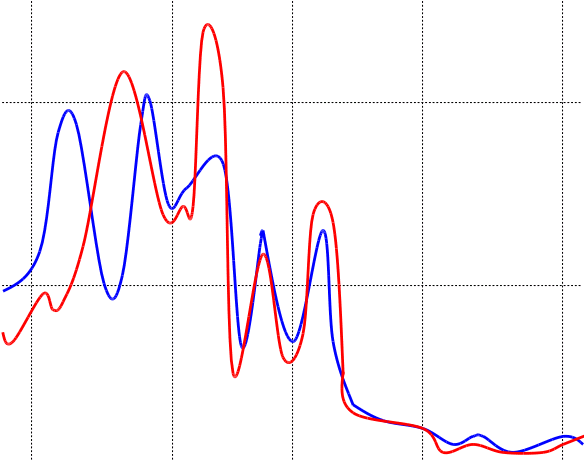 Рис. 2 Спектры мощности двух самых длительных рядов индексов SOI с 1866 г. по 1996 г. ( красная кривая) и сходных с ним индексов DT с 1851 г. по 1996 г. ( синяя кривая). По оси абсцисс приведены периоды в кварталах, по оси ординат – спектральная плотность.