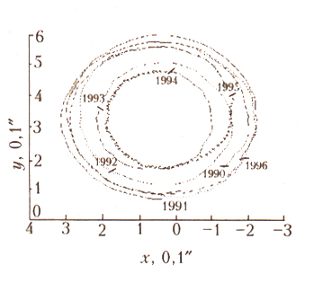 Происходящее в процессе ЭНЮК перераспределение воздушных и водных масс приводит к тому, что ось наибольшего момента инерции отклоняется по меридиану Австралии при Эль-Ниньо и по меридиану Таити при Ла-Нинья. Земля, являясь гироскопом, преобразует качания этой оси в движение оси наибольшего момента инерции Земли по конусу относительно оси суточного вращения. Из-за этого точки, в которых ось вращения пересекает земную поверхность – мгновенные полюсы Земли, - движутся. Они перемещаются по земной поверхности вокруг своего среднего положения в направлении вращения Земли, т.е. с запада на восток. Фигура, строение и физические свойства Земли таковы, что период свободных колебаний полюсов Земли равен 1,2 года. Помимо этого, чандлерова, движения полюсов имеется еще и вынужденное движение полюсов периодом 1 год. Сложение этих двух движений порождает биения, в результате которых радиус траектории полюса меняется от максимального до минимального с периодом примерно 6 лет ( рис. 5).