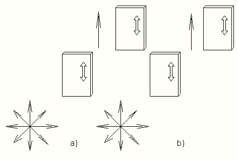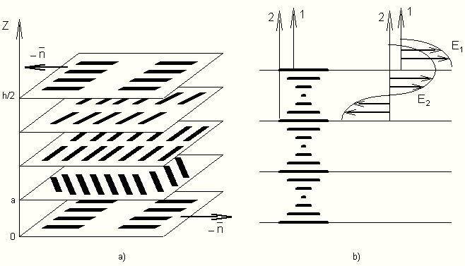 Важнейший оптический эффект, наблюдаемый в холестерической жидкости, заключается в избирательном отражении света слоем холестерика. Холестерические плоскости, как и обычные кристаллические плоскости, могут отражать падающие на них волны. Волны, отражённые разными плоскостями, могут при интерференции, и ослаблять, и усиливать друг друга. Если свет падает перпендикулярно плоскостям, то условие усиления таково: между соседними эквивалентными плоскостями должно укладываться строго пол волны падающего света. Мы хотим, чтобы колебания, отражённых от первой и второй плоскостей, проходили в одинаковых фазах, то есть значение электрического поля Е в каждой точке и в любое время были одинаковы. При этом амплитуда Ео обеих волн складываются - происходит усиления света. Так будет если волна 2 (рис64,б), вошедшая в кристалл, на пути от первой ко второй плоскости и обратно отстанет от волны 1 ровно на длину волны λ. Но в холестерике такие плоскости находятся на расстоянии h/2 друг от друга. Поэтому условие усиления в данном случае есть h/2=λ/2, или h=λ.