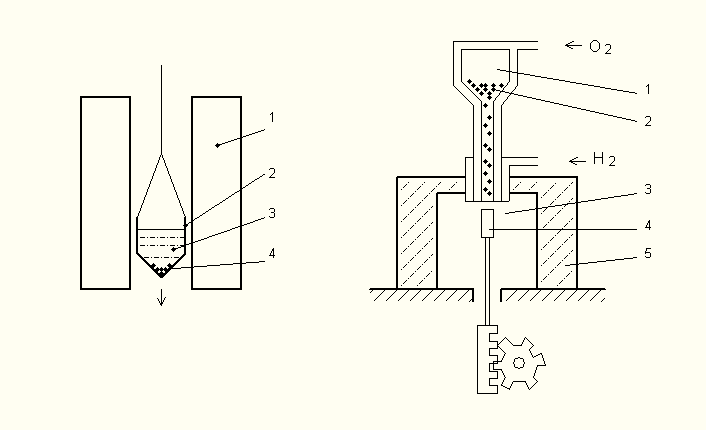 Второй способ: Тончайший порошок окиси алюминия из зёрен размером 2-100 мкм высыпается тонкой струёй из бункера, проходит через кислородно-водородное пламя, плавится и в виде капель попадает на стержень из тугоплавкого материала. Температура стержня поддерживается несколько ниже температуры (2030). Капли окиси алюминия охлаждаются на нём и образуют корку спекшейся массы корунда. Часовой механизм медленно (10-20мм/ч) опускает стержень, и на нём постепенно вырастает неогранённый кристалл корунда (рис 2).
