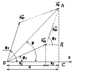 Представим оба колебания в виде векторов амплитуды Х>01> и Х>02>, Сложение векторов выполним графически.