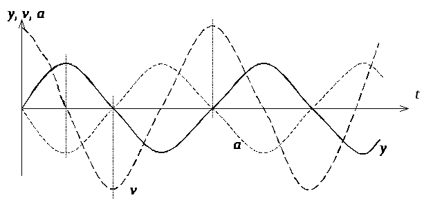 Из таблицы и графика следует, что скорость имеет максимальные значения, когда точка проходит положения равновесия, а ускорение максимально в крайних положениях.