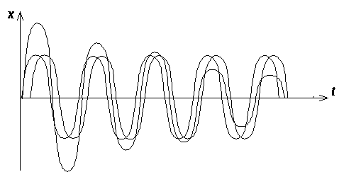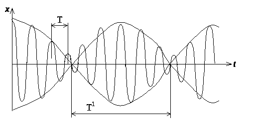 Такие колебания называются биениями. Биения - такие колебания, амплитуда которых периодически возрастает и убывает по закону cos. Максимальная амплитуда наблюдается, если фазы слагаемых колебаний совпадают. Ясли эти колебания находятся в противофазе, то они гасят друг друга.