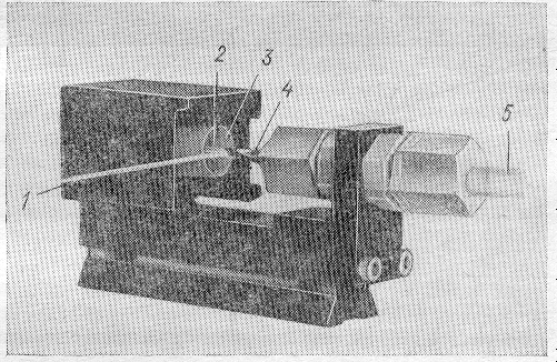 1 – лазерное излучение накачки; 2 – область потока красителя; 3 – патрубок для сбора раствора красителя; 4 – сопло; 5 – шланг для подачи раствора красителя.