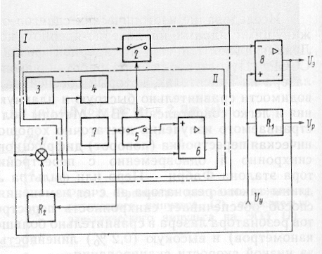 Функциональный блок (рис. 3.2) состоит из сумматора аналоговых сигналов 1, аналогового умножителя I и инвертора. Аналоговый умножитель двухквадрантного типа выполнен по схеме с широтно-импульсным преобразователем. Он включает в себя: ключи 2 и 5, генератор треугольного напряжения 3, компаратор 4, усилитель 6 и источник опорного напряжения 7. Цепь 6—5—7 обеспечивает стабилизацию широтно-импульсного модулятора II, выполненного на элементах 4 и 3. Усилитель 8 осуществляет инверсию схемы, включенной в его обратную связь, реализуя тем самым решение уравнения (3.1);
