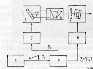Для обеспечения плавной линейной перестройки длины волны лазера на вход регулирующего устройства (РУ) 3 ЭДПР подается вырабатываемое программным генератором (ПГ) 4 линейное пилообразное напряжение, при этом в функциональном блоке (ФБ) 5, через который то же напряжение поступает на РУ 6 ЭДПЭ, формируется обратная по отношению к (3.1) зависимость