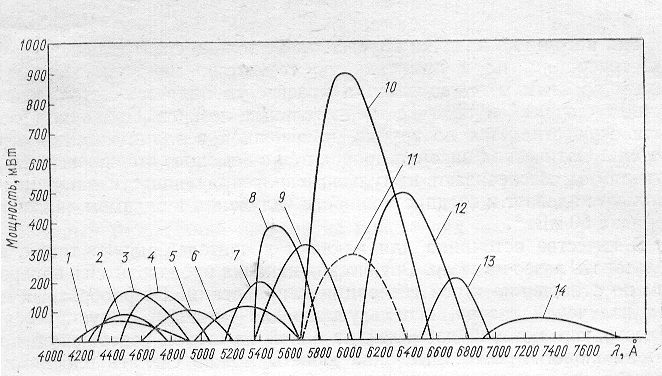 излучения); 11— родамин 6G (2 Вт суммарного