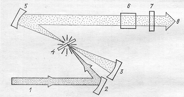 Резонатор образован отражателем 3 (с радиусом кривизны r=5 см и коэффициентом отражения R=100%) и плоским выходным зеркалом 7 (R=95-98%). Вспомогательное зеркало 5 (r - 7,5 см, R=100%) служит для уменьшения габаритов резонатора и обеспечивает параллельность лазерного излучения 8 на выходе и излучения накачки 1, направляемого в объем поворотным зеркалом 2. Поток красителя 4 направлен перпендикулярно к плоскости рисунка и расположен под углом Брюстера к излучению накачки. Длины волн перестраиваются селектирующим элементом 6.