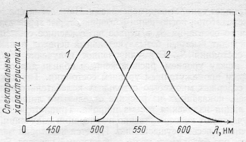 Рис. 1.1. Спектр поглощения (1) и флуоресценции (2) типичного лазерного красителя