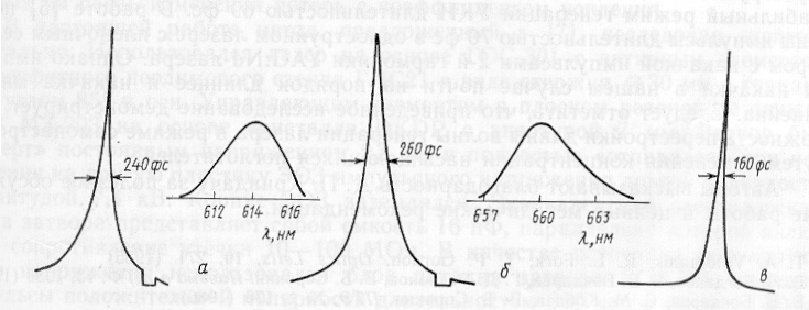 Следует обратить внимание на то, что в обоих случаях спектр генерации несимметричен и затянут в сторону, где пропускание выходного зеркала увеличивалось (для ДОДКИ в коротковолновую, для МЗ в длинноволновую). Длительности импульсов, полученные как в первом, так и во втором случаях, приблизительно одинаковы.