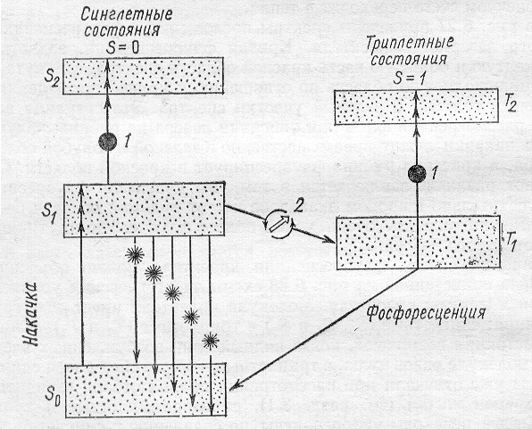 Синглет-триплетные переходы S>1>T>1> (интекомбинационные перходы 2) приводят к сильному поглощению лазерного излучения и срыву генерации за счет перехода T>1>T>2>, ограничивающих выходную мощность (перходы 1).