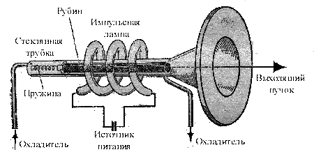 Один из торцов рубинового стержня делают зеркальным, а другой полупрозрачным. Через него выходит мощный кратковременный (длительностью около сотни микросекунд) импульс красного света, обладающий теми феноменальными свойствами, о которых было рассказано выше. Волна является когерентной, так как все атомы излучают согласованно, и очень мощной, так как при индуцированном излучении вся запасенная энергия выделяется за очень малое время.
