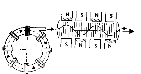 Принцип действия такого лазера основан на преобразовании энергии спектрального пучка релятивистских электронов в магнитном поле в излучение в оптическом диапазоне волн. Из рис. 9 видно, что ускорителем электронов является устройство, выполненное в виде тороида, вокруг которого располагаются магнитные катушки. Магнитное поле, создаваемое этими катушками, управляется по определенному закону, обеспечивающему ускорение электронов от одного оборота к другому. Это позволяет получить очень высокие скорости электронов. Выбрасываемые из тороида электроны попадают в устройство, называемое линейным ускорителем. Оно образовано магнитами с чередующимися полюсами. Это устройство напоминает резонатор. В нем образуется оптическое излучение, которое и выводится наружу. Поскольку процесс преобразования энергии электронов в оптическое излучение осуществляется непосредственно, то такой лазер обладает высоким кпд и может работать в режиме повторяющихся импульсов. Другим, очень важным преимуществом лазера на свободных электронах, как утверждается, является возможность перестройки длины волны излучения, что особенно важно для обеспечения более эффективного прохождения излучения в атмосфере. Первые экспериментальные установки были слишком громоздкими. Ряд последующих образцов позволил зарубежным специалистам высказать мнение, что в будущем лазеры на свободных электронах найдут применение в системах оружия, размещаемого на космических и авиационных летательных аппаратах.