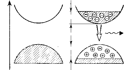 Принцип работы полупроводникового лазера может быть объяснен следующим образом. Согласно квантовой теории электроны в полупроводнике могут занимать две широкие энергетические полосы (рис. 8). Нижняя представляет собой валентную зону, а верхняя – зону проводимости. В нормальном чистом полупроводнике при низкой температуре все электроны связаны и занимают энергетический уровень, расположенный в пределах валентной зоны. Если на полупроводник подействовать электрическим током или световыми импульсами, то часть электронов перейдет в зону проводимости. В результате перехода в валентной зоне окажутся свободные места, которые в физике называют «дырками». Эти дырки играют роль положительного заряда. Произойдёт перераспределение электронов между уровнями валентной зоны и зоны проводимости, и можно говорить, в определенном смысле, о перенаселенности верхней энергетической зоны.