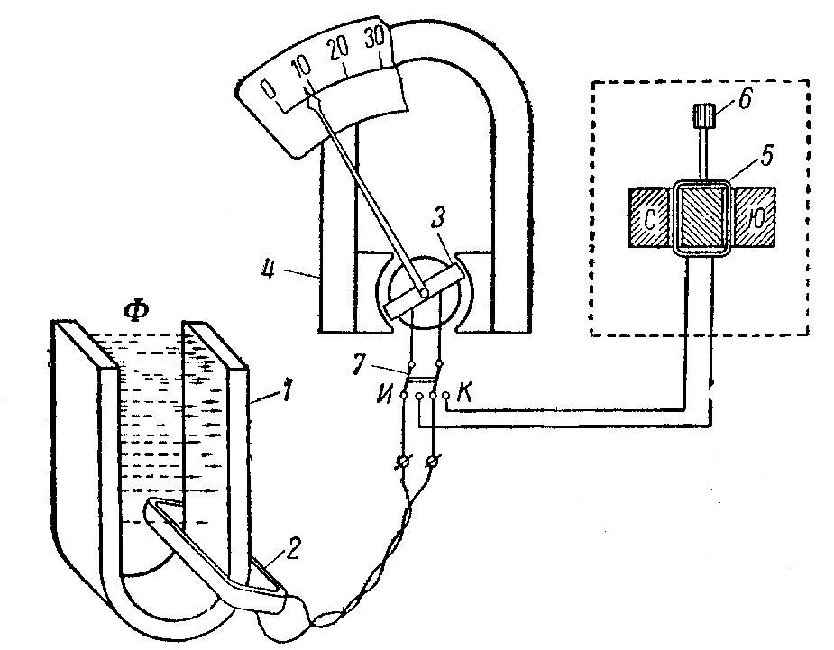 Для изменения положения указателя флюксметра относительно его шкалы, в частности для установки указателя на нулевую отметку, переключатель 7 переводят в положение, отмеченное буквой К, при котором рамка прибора соединяется с рамкой корректирующего устройства. При этой схеме поворот рамки 5 головкой 6 будет вызывать соответствующее изменение положения указателя флюксметра. Установив указатель флюксметра в желаемое положение, переводят переключатель 7 в рабочее положение, отмеченное на рис. 3 буквой И.
