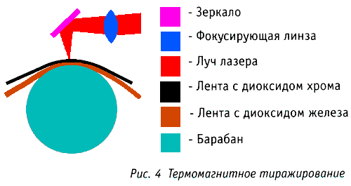 К барабану прижаты две ленты: снизу с носителем из гамма-диоксида железа - оригинал, сверху с диоксидом хрома - копия. Ленты соприкасаются рабочими слоями. Сфокусированный луч лазера разогревает рабочий слой ленты-копии до температуры немного выше точки Кюри. Температура разогретой точки (точнее штриха с длиной, равной ширине дорожки записи) достаточно быстро остывает за счет тепловой диффузии. При переходе через точку фазового перехода, когда магнитная восприимчивость сверхвысокая, рабочий слой ленты-копии легко намагничивается. При дальнейшем остывании магнитная восприимчивость быстро уменьшается и запись относительно слабых полей, создаваемых лентой-оригиналом, становится невозможной. В процессе транспортировки лент оригинала и копии зона записи перемещается. Скопированная сигналограмма зеркальна по отношению к сигналограмме оригинала. Поэтому запись оригинала ведется так, чтобы формировалась сигналограмма, зеркальная по отношению к стандартной. Скорость тиражирования прямо зависит от мощности лазера. Реально удалось реализовать тиражные машины со скоростями копирования в 300 и более раз выше номинальной.