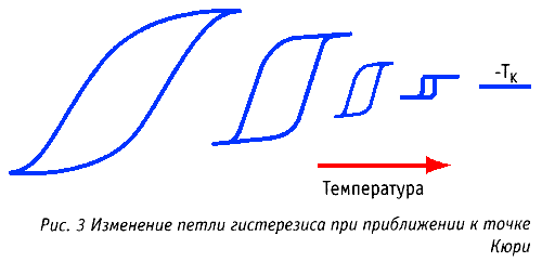 По мере роста температуры возрастает крутизна наклонных участков петли гистерезиса (соответственно, и |i). При этом уменьшается коэрцитивная сила и максимальная остаточная намагниченность, а отношение В>Н>/Н>К> растет. Все это ведет к резкому росту эффективности записи.