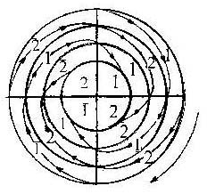 Но вновь сформировавшиеся сферы миров уже имеют свои центры масс и антимасс. Энергия из этих миров начинает утекать в центральную сферу миров. Это приводит к тому что все сферы миров начинают вращаться в направлении указанным стрелкой.