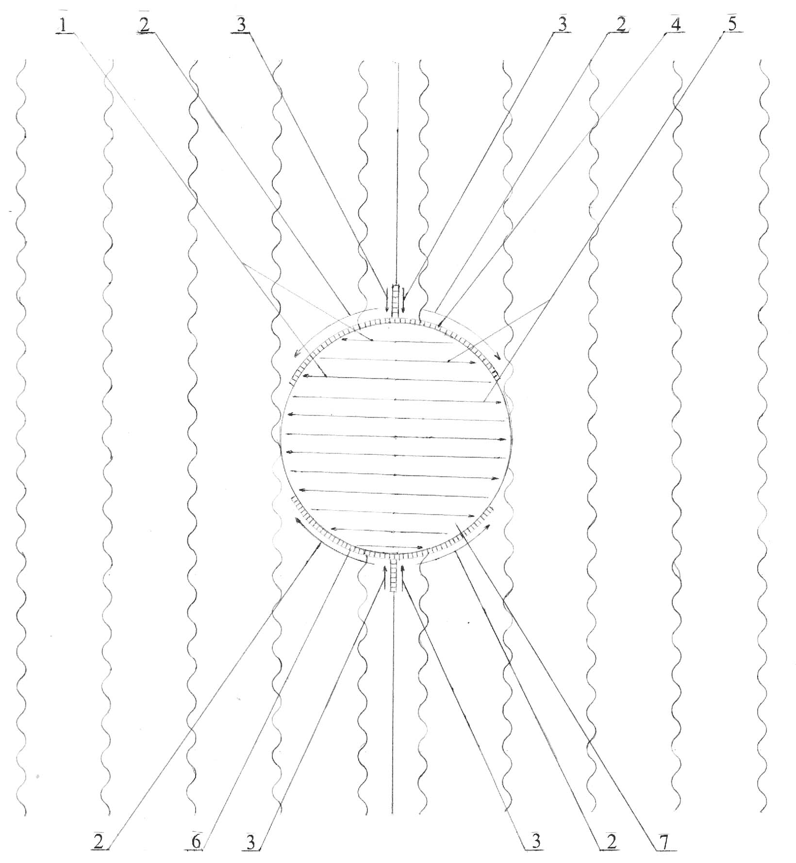 На рисунке 1 изображен продольный разрез модели атома водорода. На конце нейтринной цепочки 4, находится электрон 5. На другом конце нейтринной цепочки внутри структуры нейтрон 3 находится позитрон 2. Структура нейтрон состоит из восьми частиц (на разрезе изображено четыре).