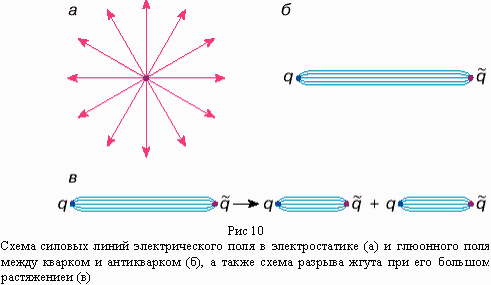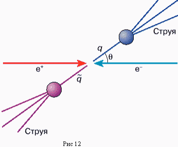 Как мы уже говорили, жгут (струна) силовых линий при достаточно большом растяжении рвется на составляющие. При большой энергии кварка и антикварка, как говорилось ранее, струна рвется во многих местах, в результате чего в обоих направлениях вдоль линии полета кварка q и антикварка образуются два узких пучка вторичных бесцветных частиц, как это показано на рисунке. Такие пучки частиц названы струями. Достаточно часто на опыте наблюдается образование трех, четырех и более струй частиц одновременно.