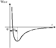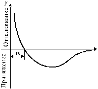 На рис. 3 дан график зависимости потенциальной энергии взаимодействия молекул от расстояния между ними. Расстояние r>0> между молекулами соответствует минимуму их потенциальной энергии (рис. 3). Для изменения расстояния между молекулами в ту или другую сторону требуется затратить работу против преобладающих сил притяжения или отталкивания. На меньших расстояниях (рис. 2) кривая круто поднимается вверх; эта область соответствует сильному отталкиванию молекул (обусловленному главным образом кулоновским отталкиванием сближающихся ядер). На больших расстояниях молекулы притягиваются. Расстояние r>0> соответствует устойчивому равновесному взаимному положению молекул. Из рис. 2 видно, что при увеличении расстояния между молекулами, преобладающие силы притяжения восстанавливают равновесное положение, а при уменьшении расстояние между ними равновесие восстанавливается преобладающими силами отталкивания.
