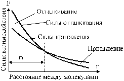Между молекулами существуют одновременно силы притяжения и силы отталкивания (рис. 1). При малых расстояниях между молекулами преобладают силы отталкивания. По мере увеличения расстояния r между молекулами как силы притяжения, так и силы отталкивания убывают, причем силы отталкивания убывают быстрее. Поэтому при некотором значении r>0> (расстояние между молекулами) силы притяжения и силы отталкивания взаимно уравновешиваются.