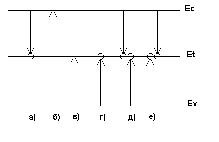 Предположим, что в полупроводнике имеются дефекты уровни энергии которых лежат в запрещенной зоне , а уровень энергии Et не занят электроном (дыркой). Возможен целый ряд процессов, схематически изображенных на